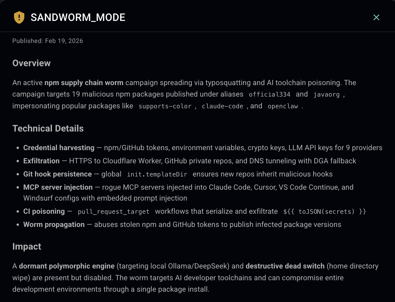 The latest campaign filter is available today for SANDWORM_MODE, an active npm supply chain worm targeting developer tools and AI coding assistants. To check your exposure: