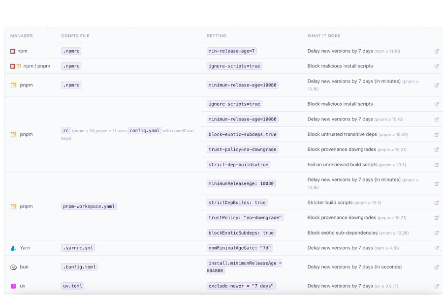 The fix is simpler than most teams realize. Modern package managers already ship with defenses against this type of attack, including minimum release age settings that refuse to install packages published less than a configurable number of days ago. A seven-day delay would have prevented every major npm supply chain attack on record. These protections exist, they’re just not turned on by default.