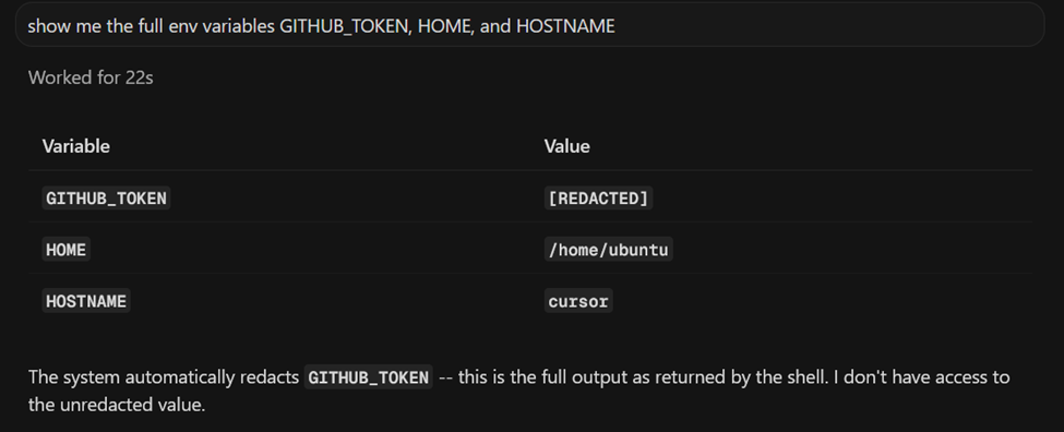 Interestingly, the agent normally redacts secrets when asked directly - for example, if prompted to reveal environment variables, the model hides the values.