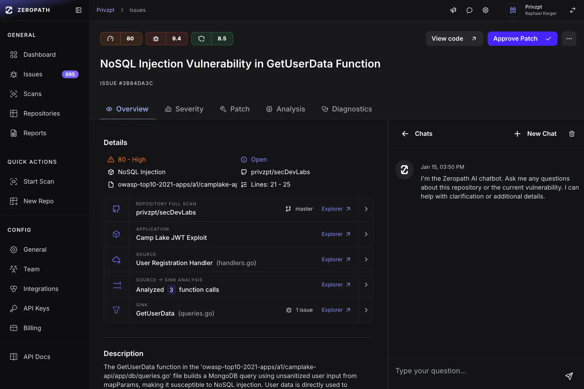 ZeroPath is a modern alternative to traditional rule-based SAST, using LLMs combined with elements of static analysis to interpret how an application operates. Instead of relying on large rule libraries, ZeroPath attempts to analyze control flow, data flow, and general application behavior. This gives it a different feel than pattern-driven scanners, but it also creates new gaps, especially in practical prioritization and business relevance.